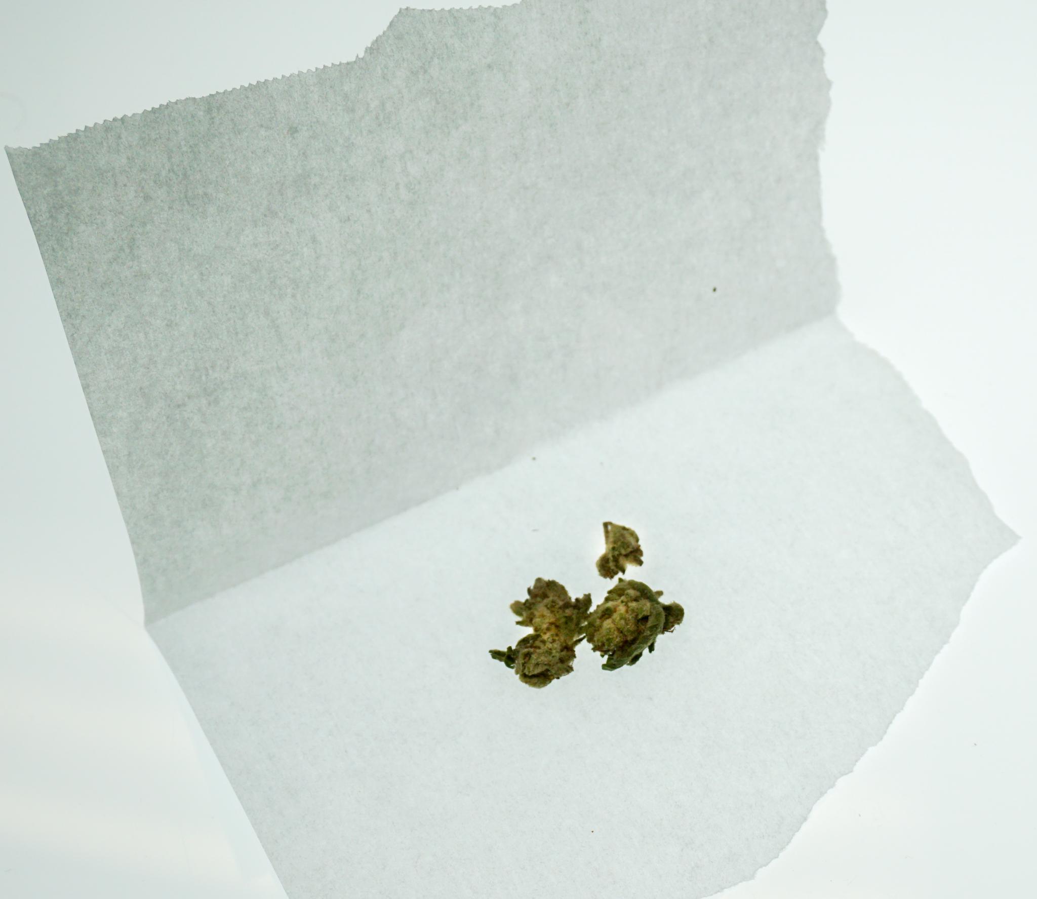Position approximately 0.25g your herbs of choice one one side of the crease in the parchment as close to the center as you can, and fold the paper over it.