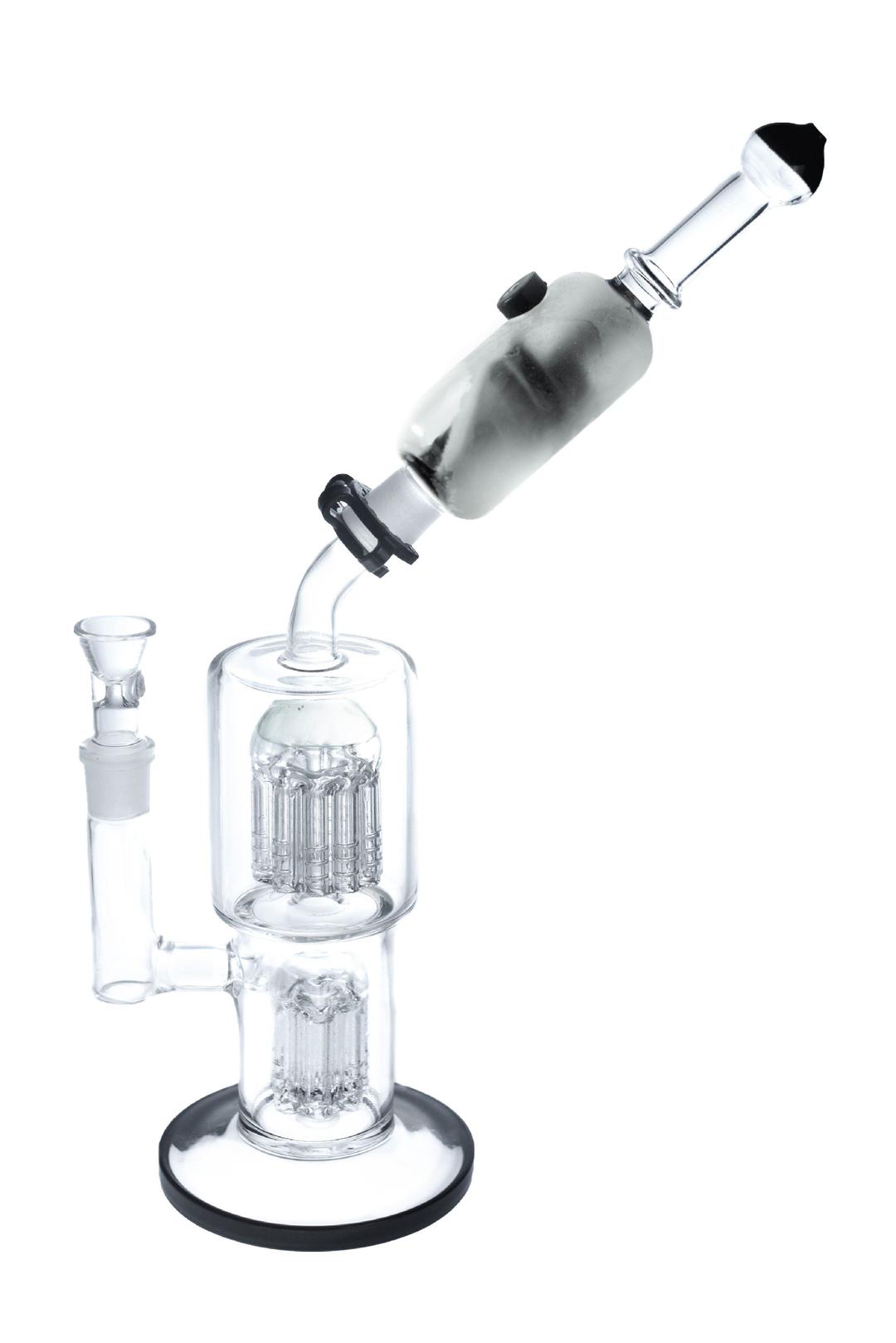 The smoke's journey begins in the bottom water chamber where it's wrung through 8 tree-arm percolators. Each percolator efficiently churns water to create bubbles and additional surface area for water and smoke to interact. Smoke then travels up the center tube into the top water chamber. This chamber provides 10 more tree-arm percs for further refinement. All this water and smoke interaction not only improves taste and cools smoke, but removes harmful particles leaving just the THC to be consumed.
