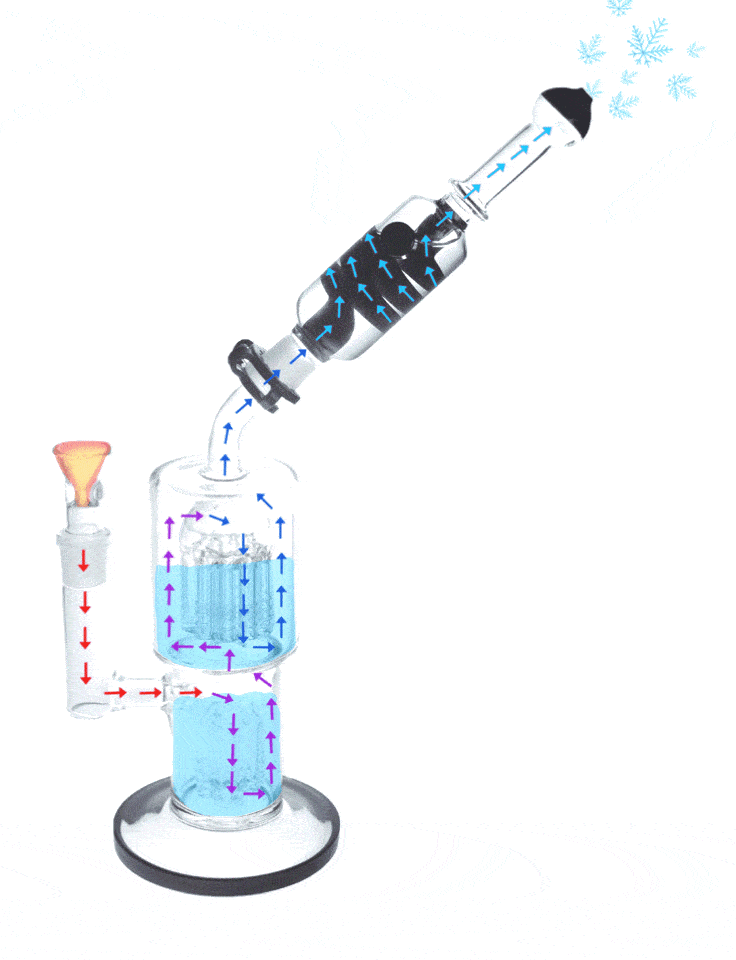 Our glycerin chambers are designed to improve how much and how long your smoke is chilled for. Upon entering an icy glycerin chamber smoke is put through a series of loops which extends the amount of time it's chilled for. This prolonged journey is so effective it reduces the smoke's temperature by 300 degrees!